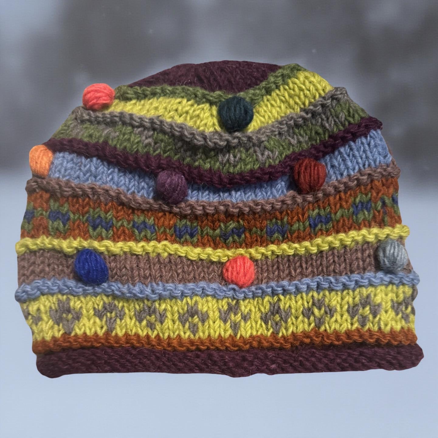 These unique and handmade Babble Hats were created by women in Nepal who have been victims of Trafficking, Domestic Violence and Civil War. Purchasing these hats helps enpower them to be self sufficient and independent.